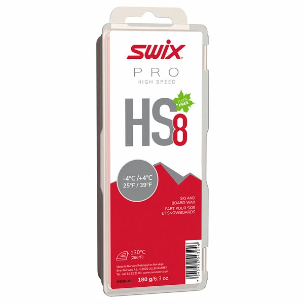HS8 er en populær voks for både grunnpreparering og trening. Den kan også benyttes som en racingvoks. fortrinnsvis med topping som siste lag. Den er lett å smelte. og svært praktisk å arbeide med. Hastigheten på smørejernet bør være ca. 8-10 sek. på en skøyte- eller alpinski. Voksen kan varmes opp på nytt etter nedkjøling til romtemperatur (10 min.) for bedre holdbarhet. Det er viktig å ha et godt smørejern for å få effektiv smelting av voksen.
